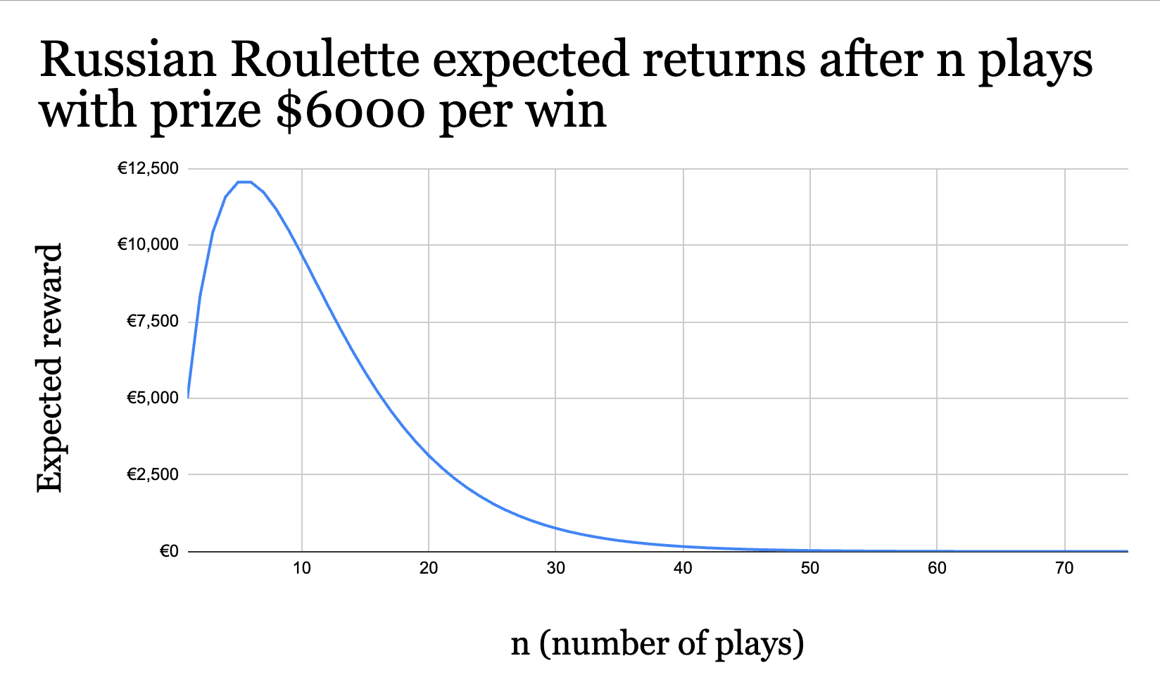 What if you play it 10 times? The average outcome is not 10 times the average returns of playing it once, but death.